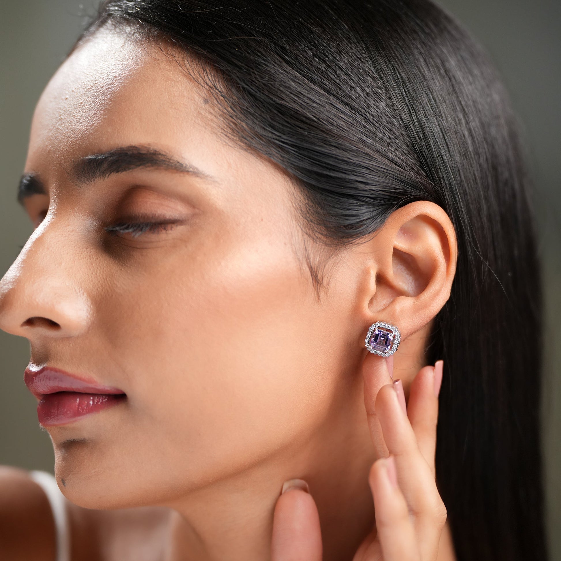 These studs feature a captivating Asscher-cut amethyst gemstone, known for its unique square shape and step-cut facets that create a mesmerizing hall-of-mirrors effect. Set in a delicate halo of smaller cubic zirconia stones, these studs offer a vintage-inspired elegance with a modern twist, perfect for adding a touch of sophistication to any ensemble.๐Ÿ’œ