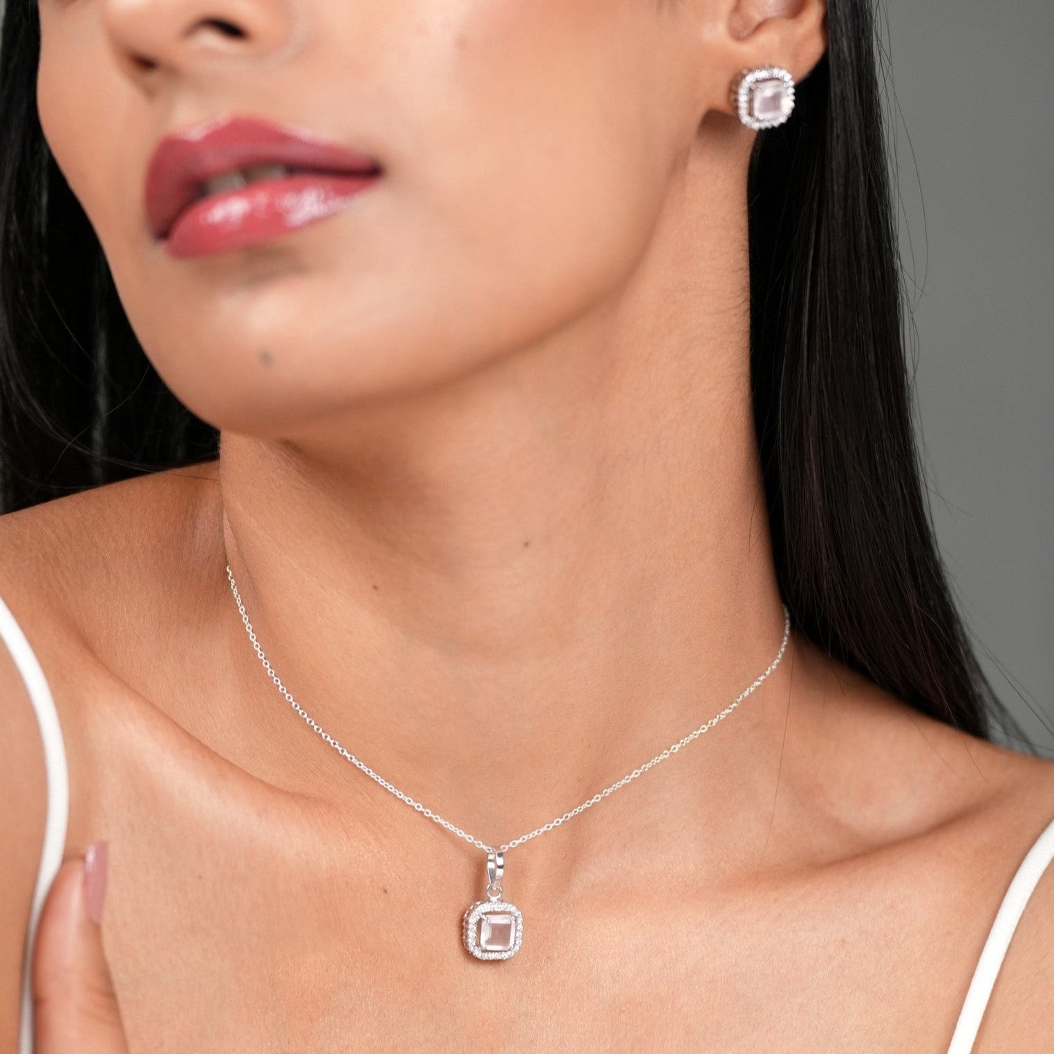 Asscher Cut 925 Silver Rose Quartz Pendant And Earring Set