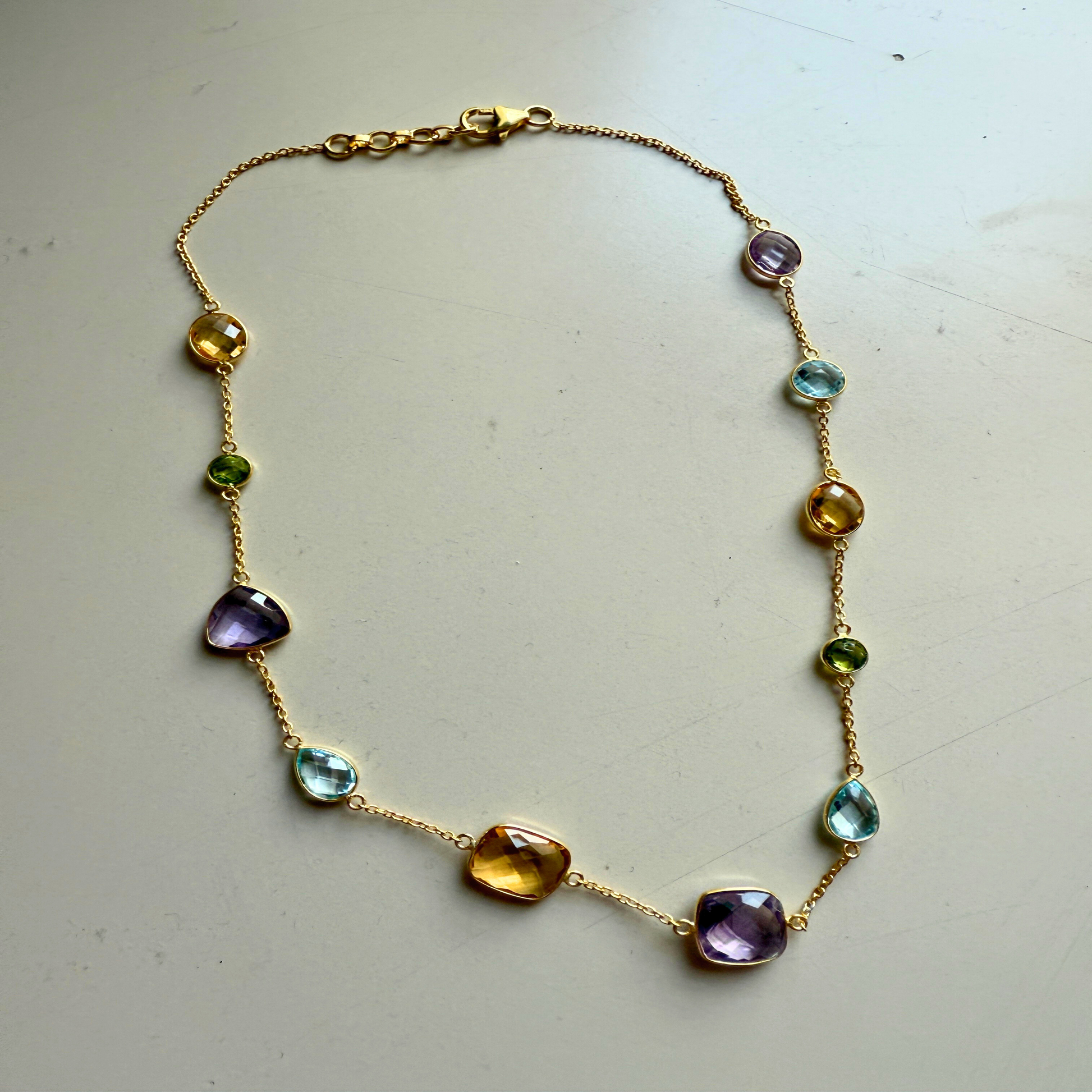 This elegant gemstone necklace features a stunning combination of Amethyst, Sky Blue Topaz, Citrine, and Peridot, each delicately set along a fine gold chain. The vibrant, natural gemstones are carefully cut to enhance their brilliance and color, creating a playful yet sophisticated look perfect for everyday wear or special occasions.