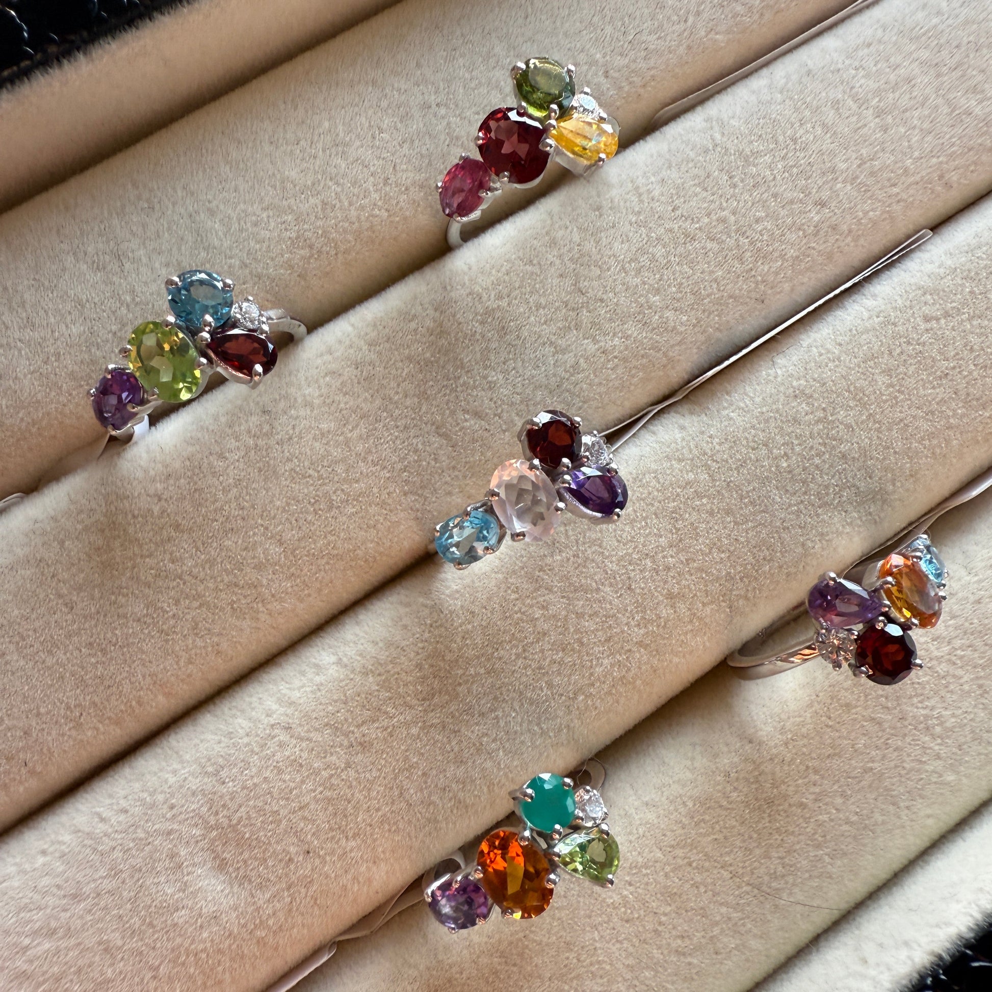 This exquisite ring features a cluster of natural Sky Blue topaz, Amethyst, Garnet and Peridot in varying rich colourful tones, beautifully set on a sleek 925 silver base with White Rhodium. Each stone is hand-selected for its brilliance and individuality, creating a vibrant play of colors that symbolize healing, growth, and positivity. A perfect statement piece that blends elegance with nature’s charm, making it ideal for both daily wear and special occasions.✨