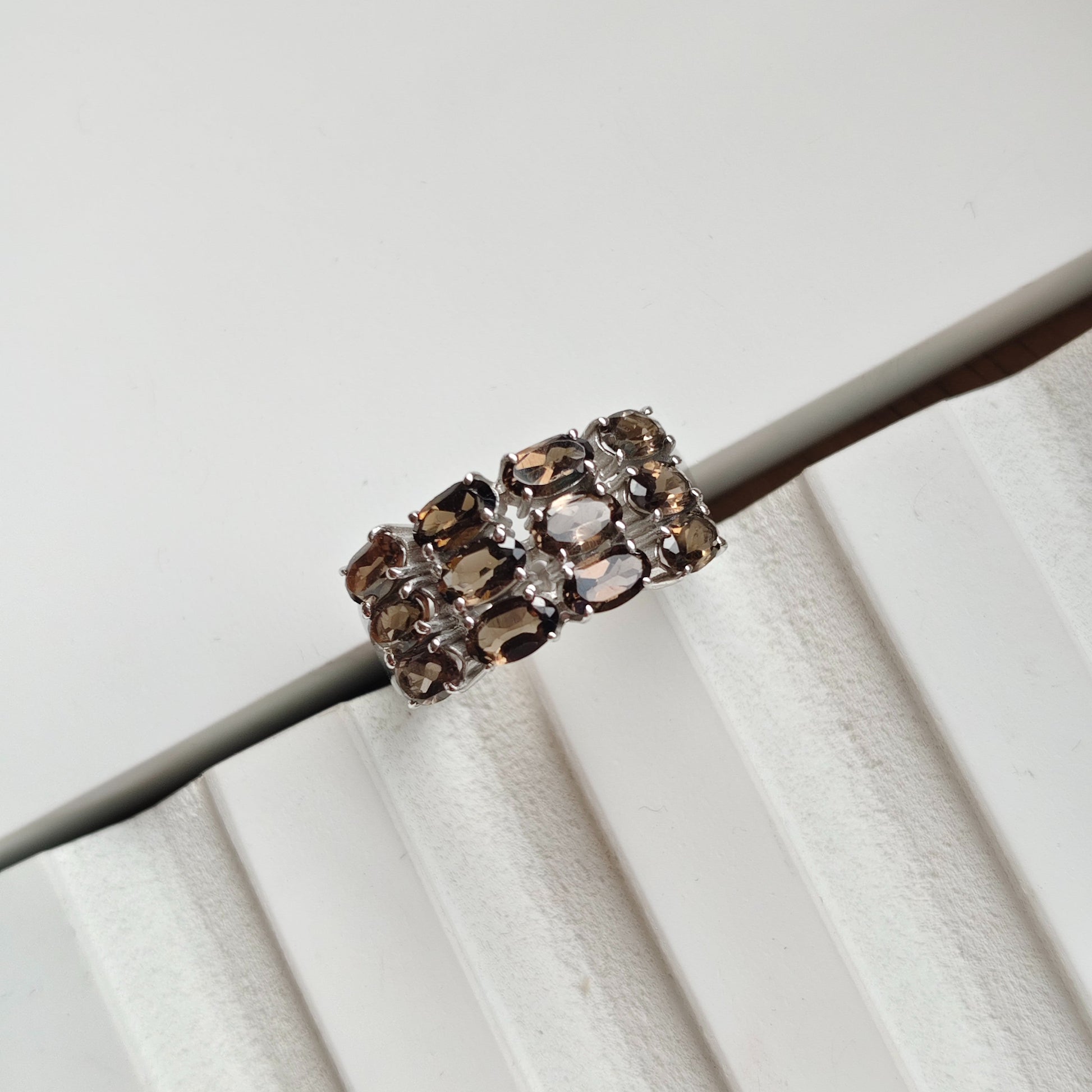 This is a sterling silver clustered nest ring, featuring a double row of smoky quartz gemstones. This ring offers a modern and elegant design, perfect for adding a touch of color to any outfit.✨