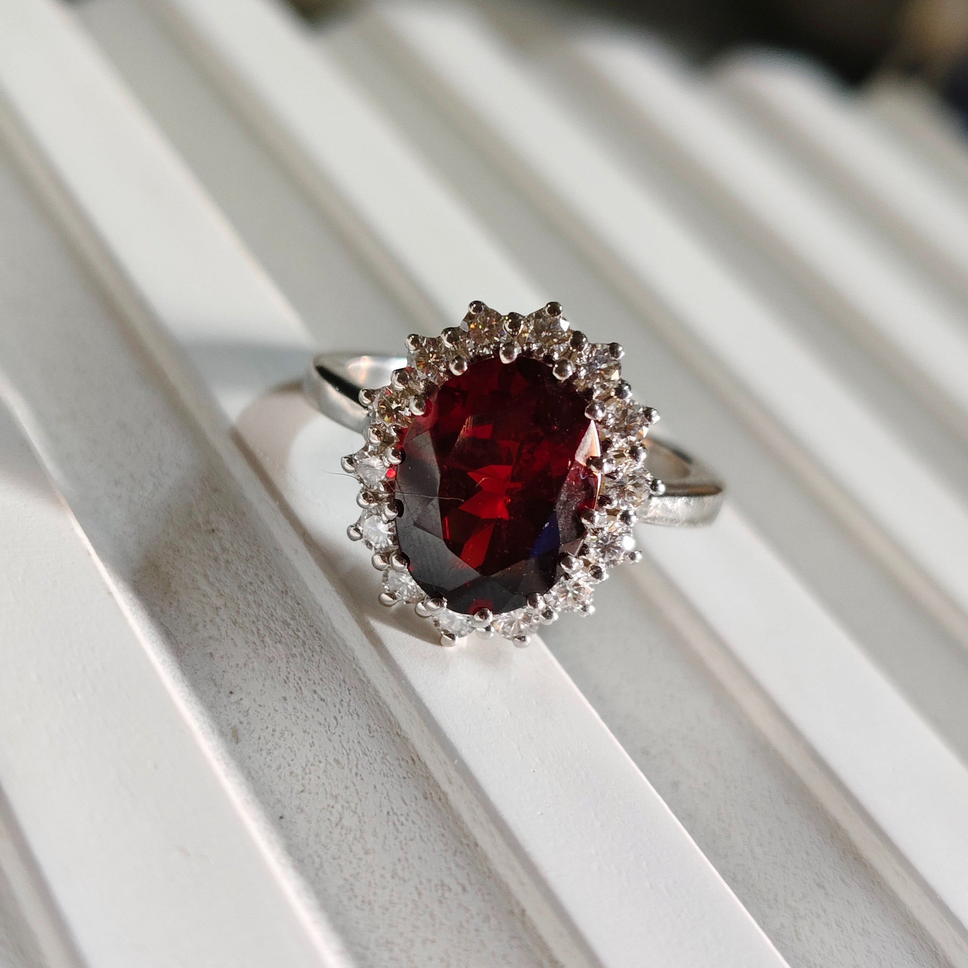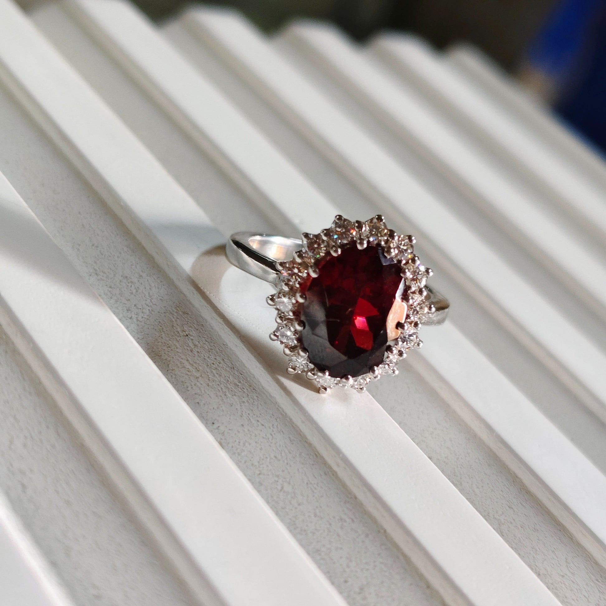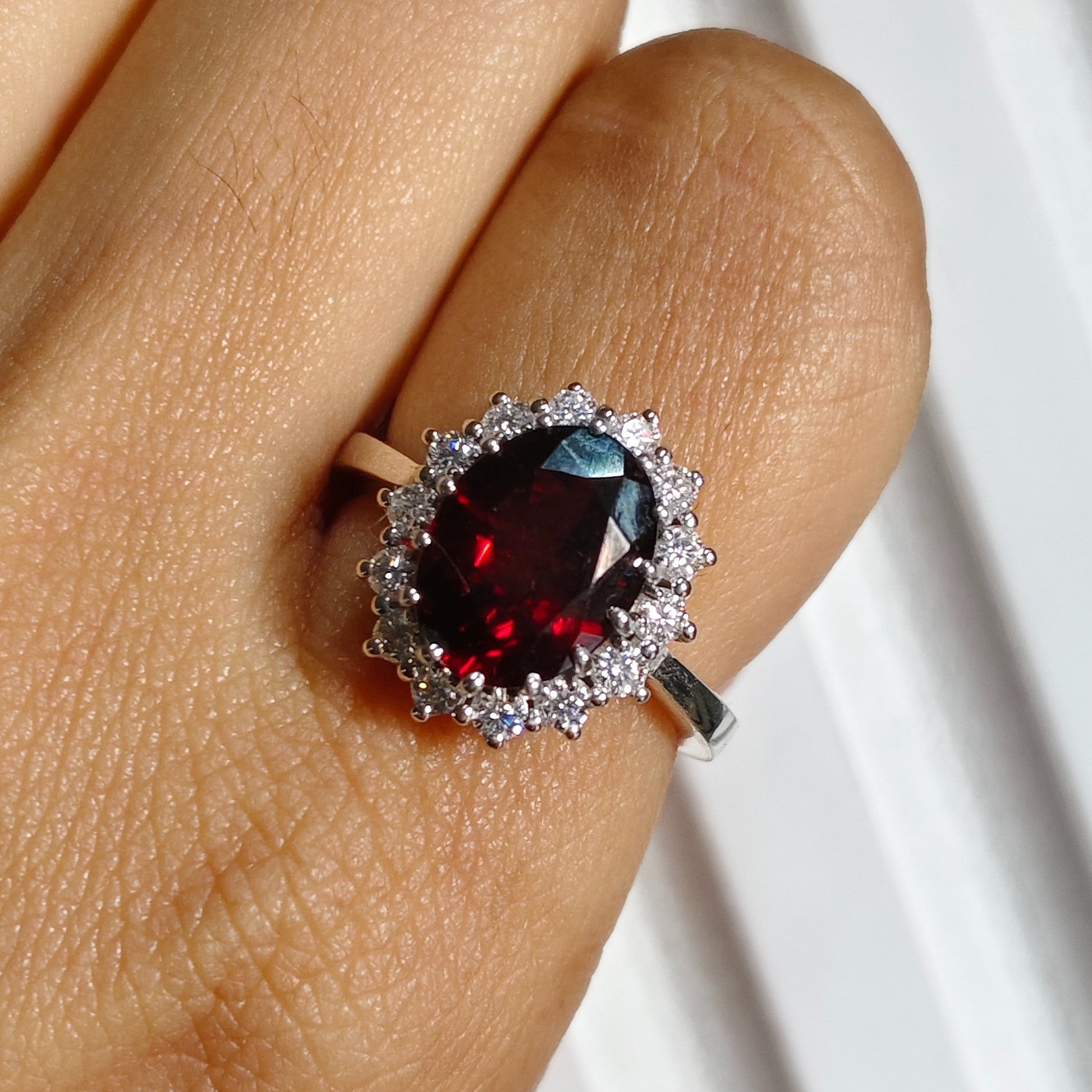 Inspired by the iconic ring worn by Princess Diana, this exquisite garnet ring is thoughtfully crafted to reflect the same timeless elegance and royal charm. From the oval deep-red garnet center stone to the classic halo of sparkling white stones, every detail is designed in alignment with the original Diana-style silhouette.❤️