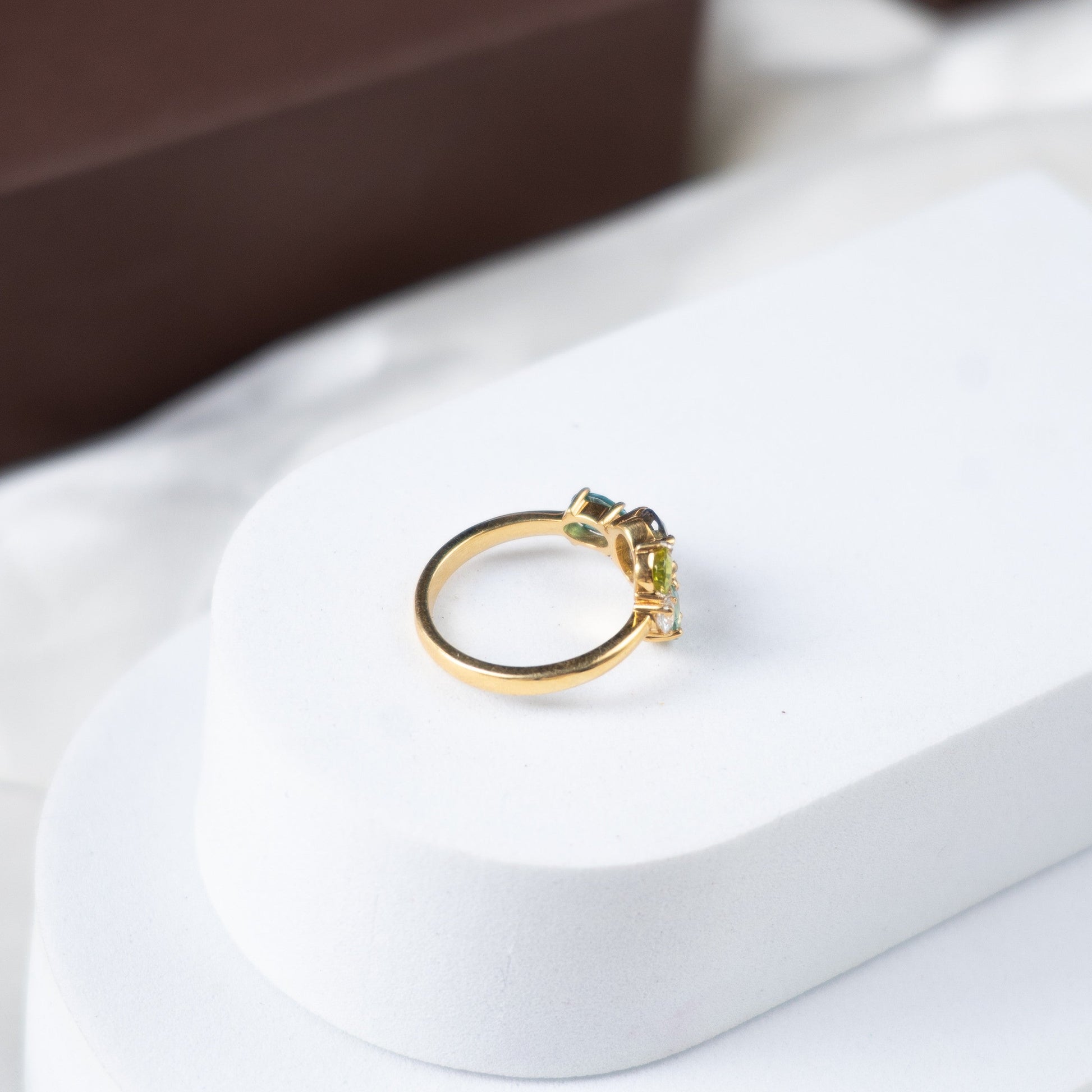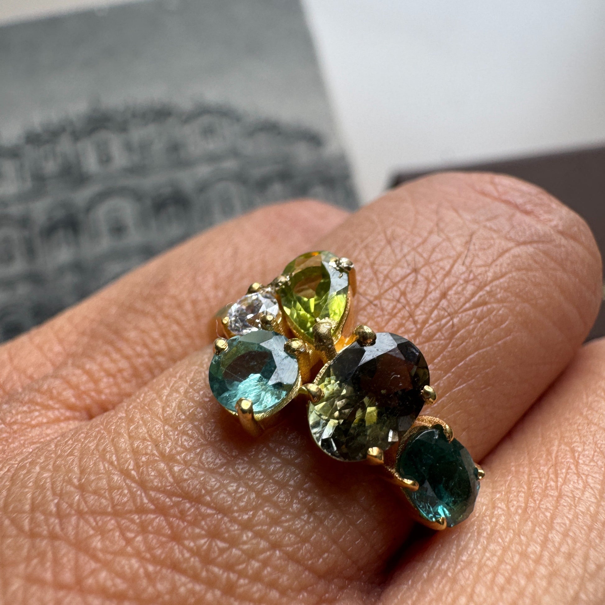 This exquisite ring features a cluster of natural green tourmaline gemstones in varying rich green tones, beautifully set on a sleek 925 silver base with gold plating. Each stone is hand-selected for its brilliance and individuality, creating a vibrant play of colors that symbolize healing, growth, and positivity. A perfect statement piece that blends elegance with nature’s charm, making it ideal for both daily wear and special occasions.✨