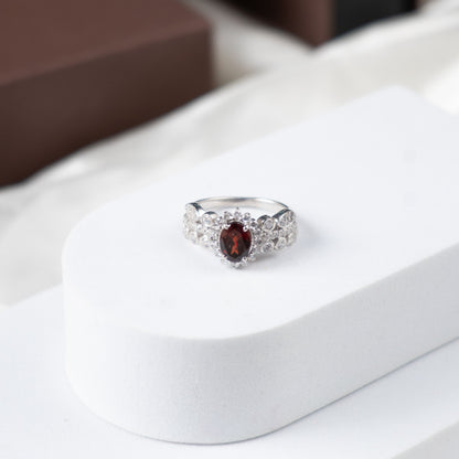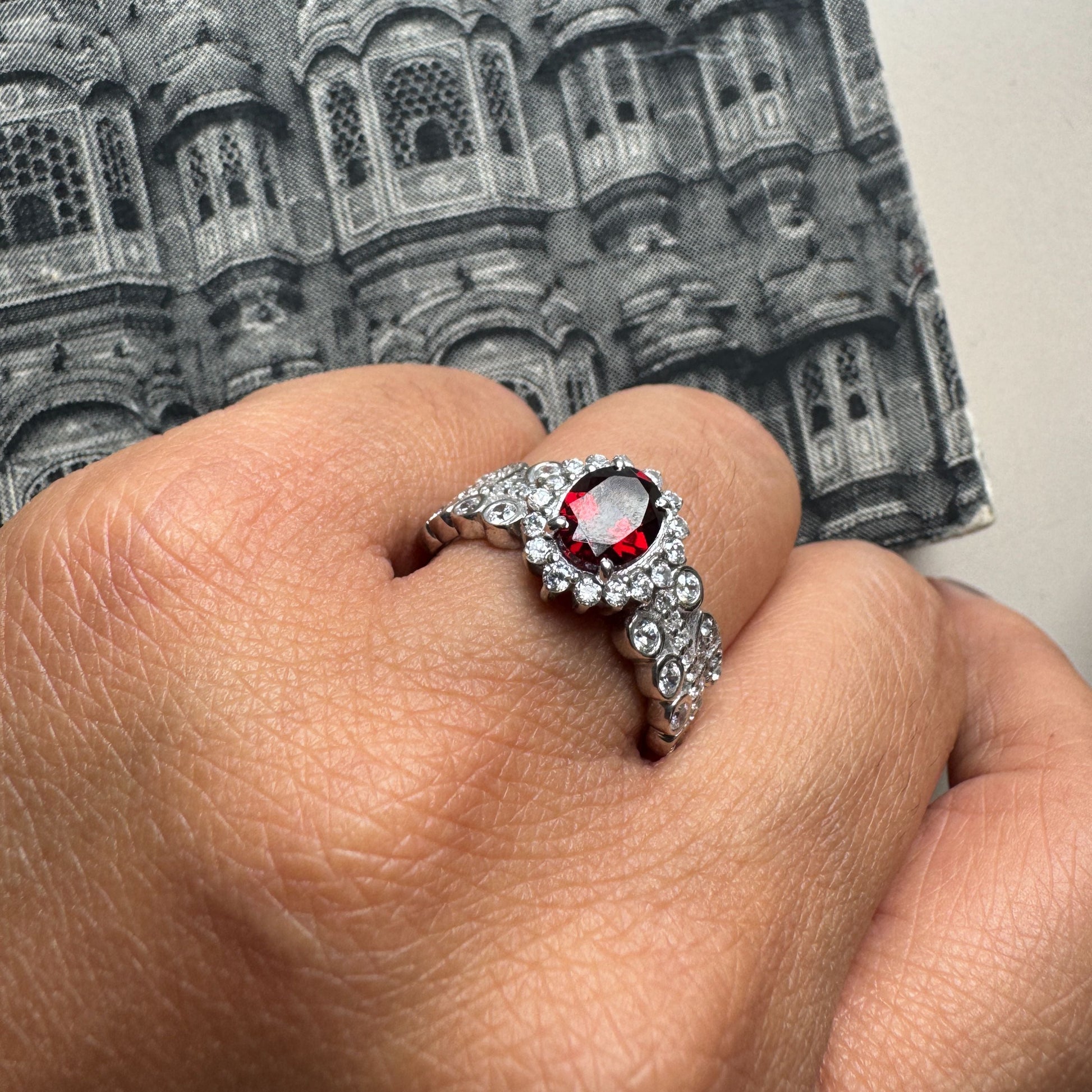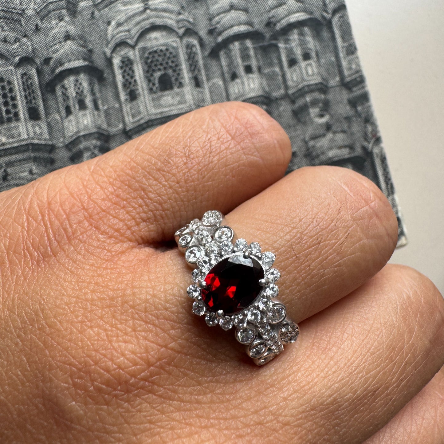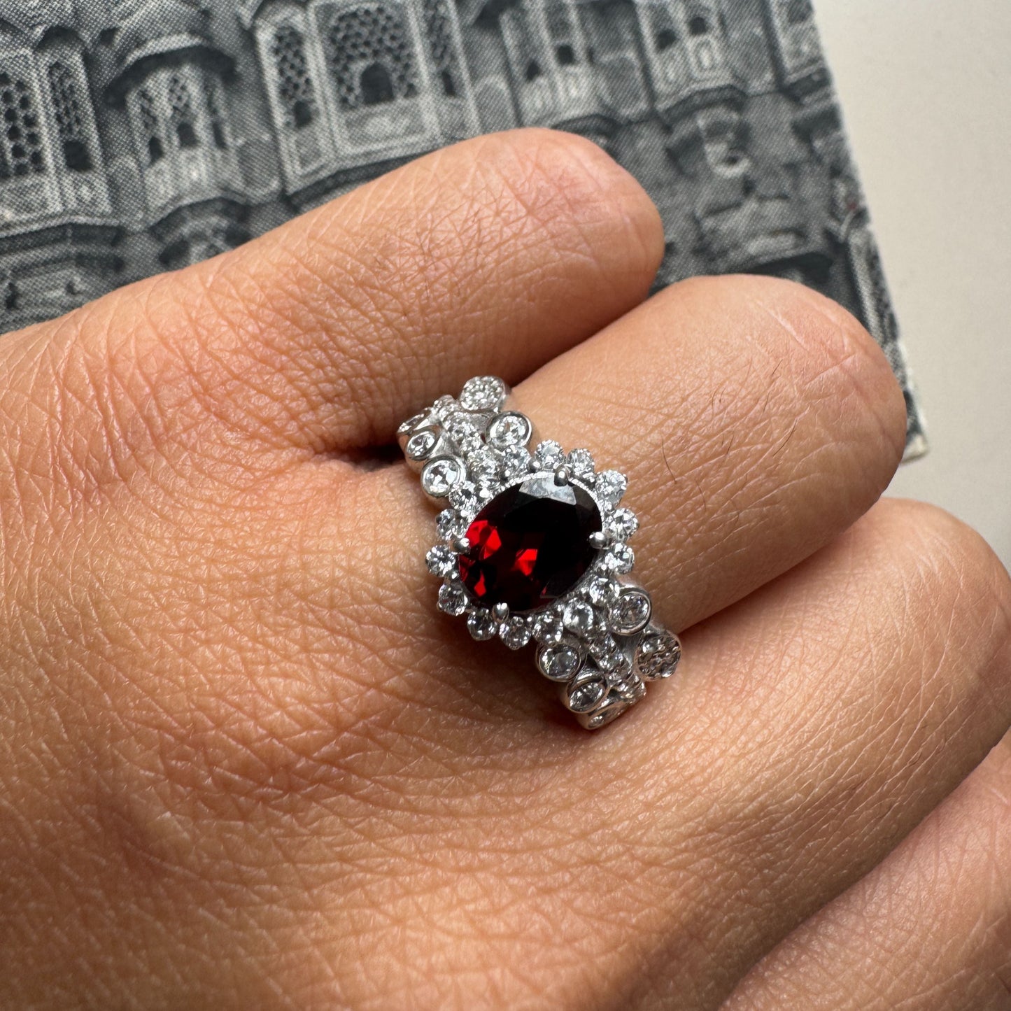 This exquisite ring features a rich, deep red oval garnet at its heart — a gemstone known for passion, strength, and protection. It is beautifully framed with sparkling high-grade CZ stones, giving it a royal, crown-like finish. The intricate band detailing in hallmarked 925 silver adds to its luxurious feel, making it perfect for both special occasions and statement daily wear.✨