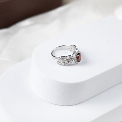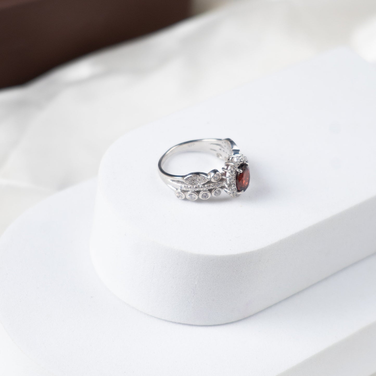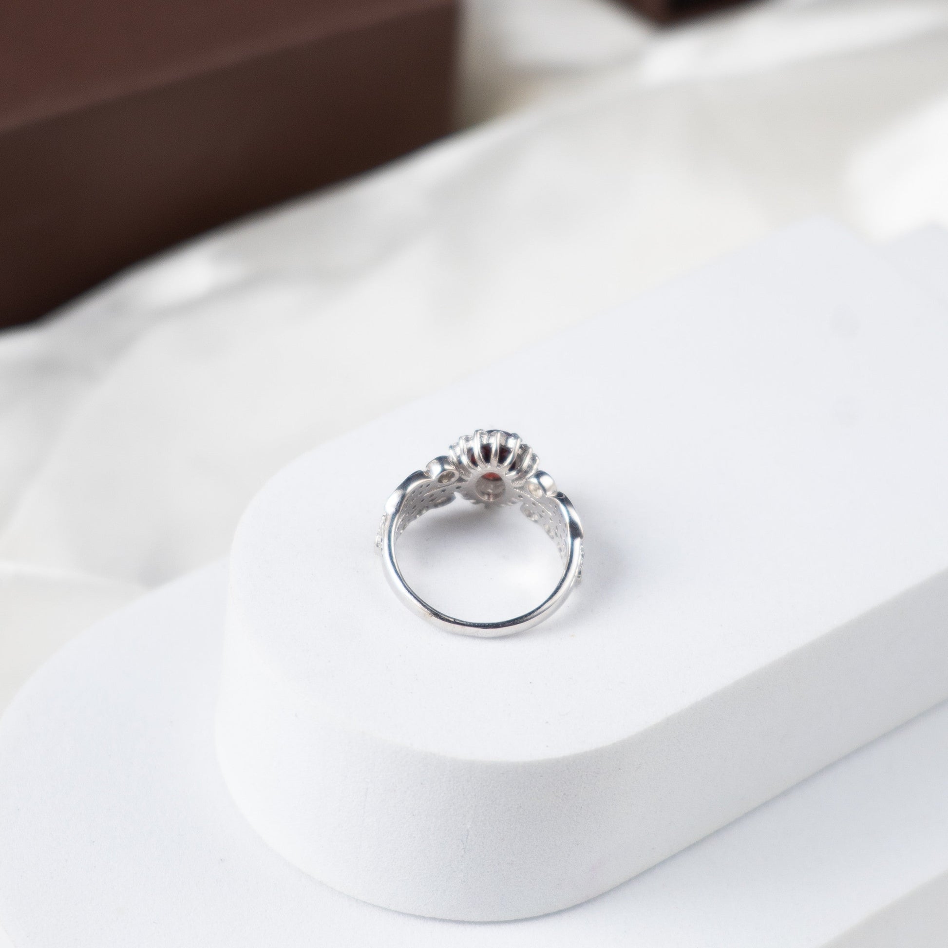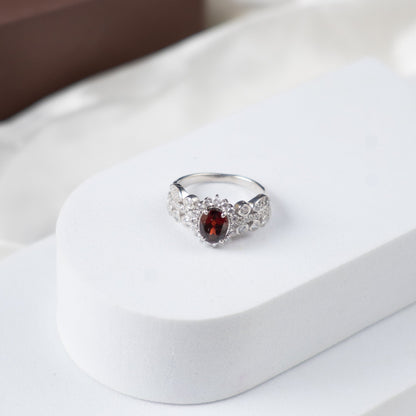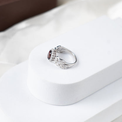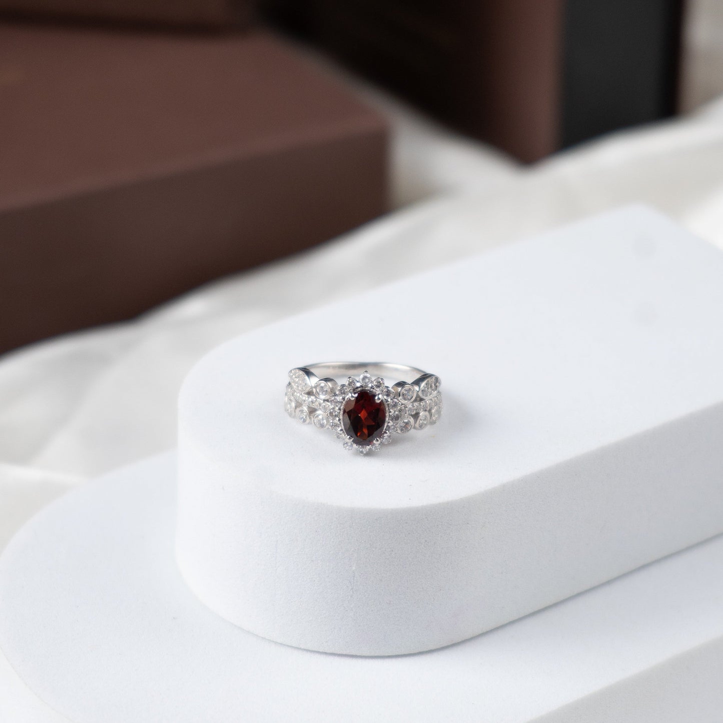 This exquisite ring features a rich, deep red oval garnet at its heart — a gemstone known for passion, strength, and protection. It is beautifully framed with sparkling high-grade CZ stones, giving it a royal, crown-like finish. The intricate band detailing in hallmarked 925 silver adds to its luxurious feel, making it perfect for both special occasions and statement daily wear.✨