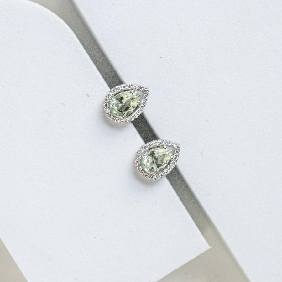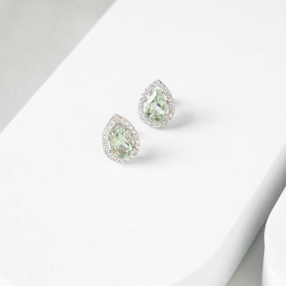 These studs feature a pear-shaped green amethyst gemstone, surrounded by a halo of sparkling cubic zirconia stones, set in 925 sterling silver. These elegant studs, ideal as a Valentine's Day gift, showcase a classic design with a vibrant center stone, embodying both luxury and joy.💚