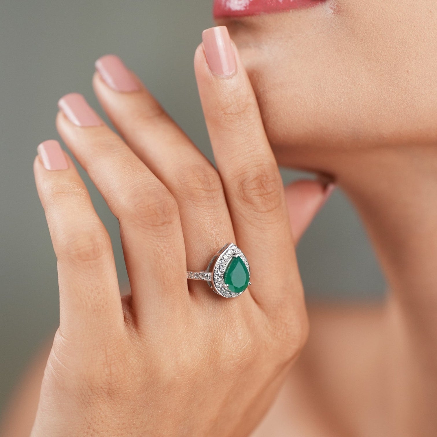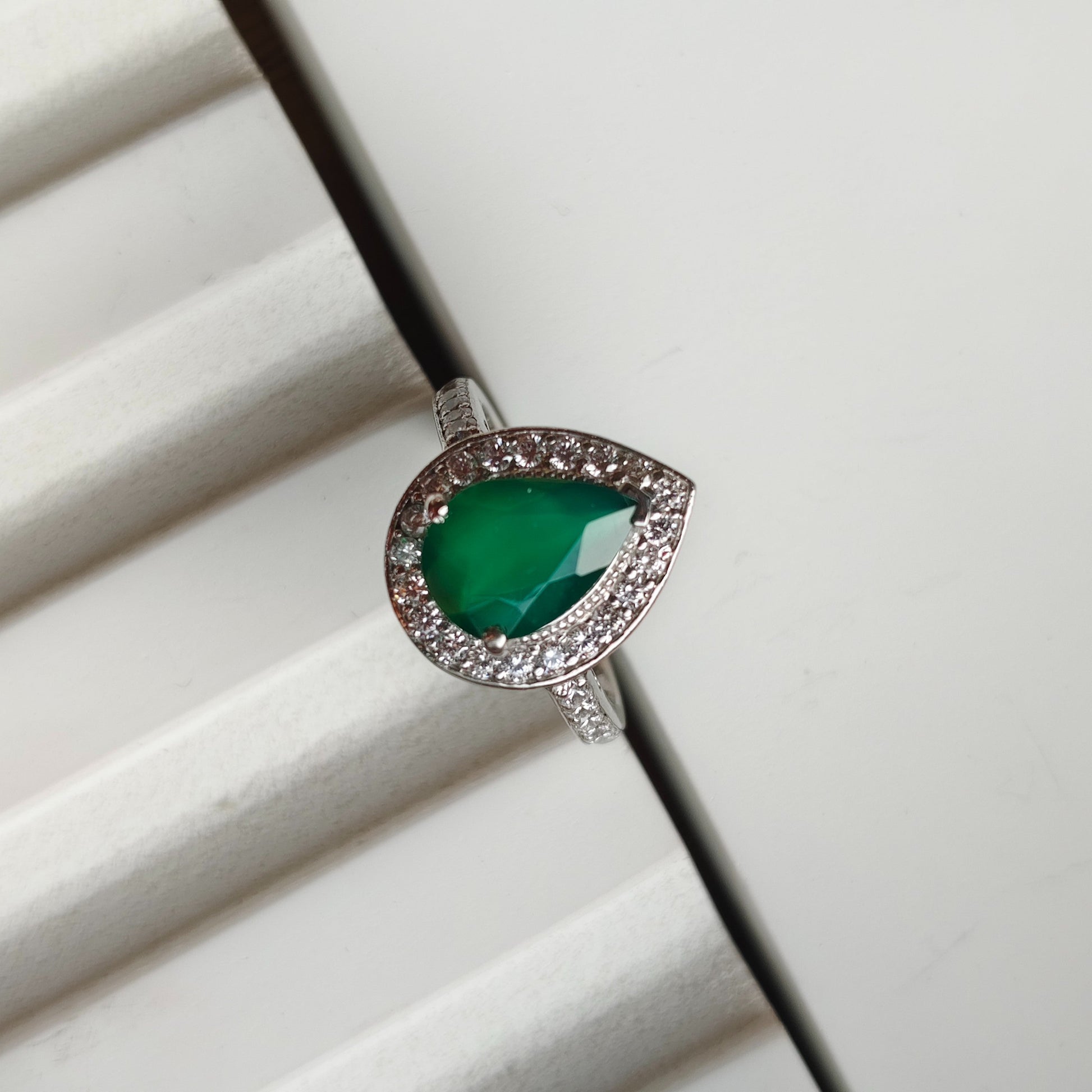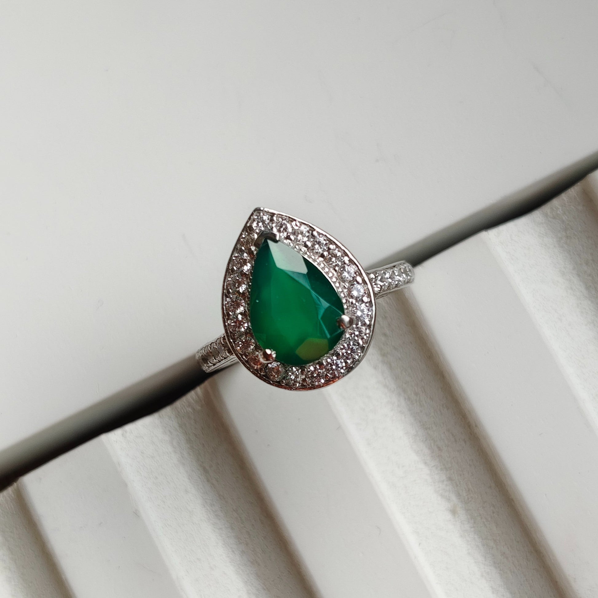 This ring features a pear-shaped green onyx gemstone, surrounded by a halo of sparkling cubic zirconia stones, set in 925 sterling silver. This elegant ring, ideal as a Valentine's Day gift, showcases a classic design with a vibrant green center stone, embodying both luxury and joy.💚