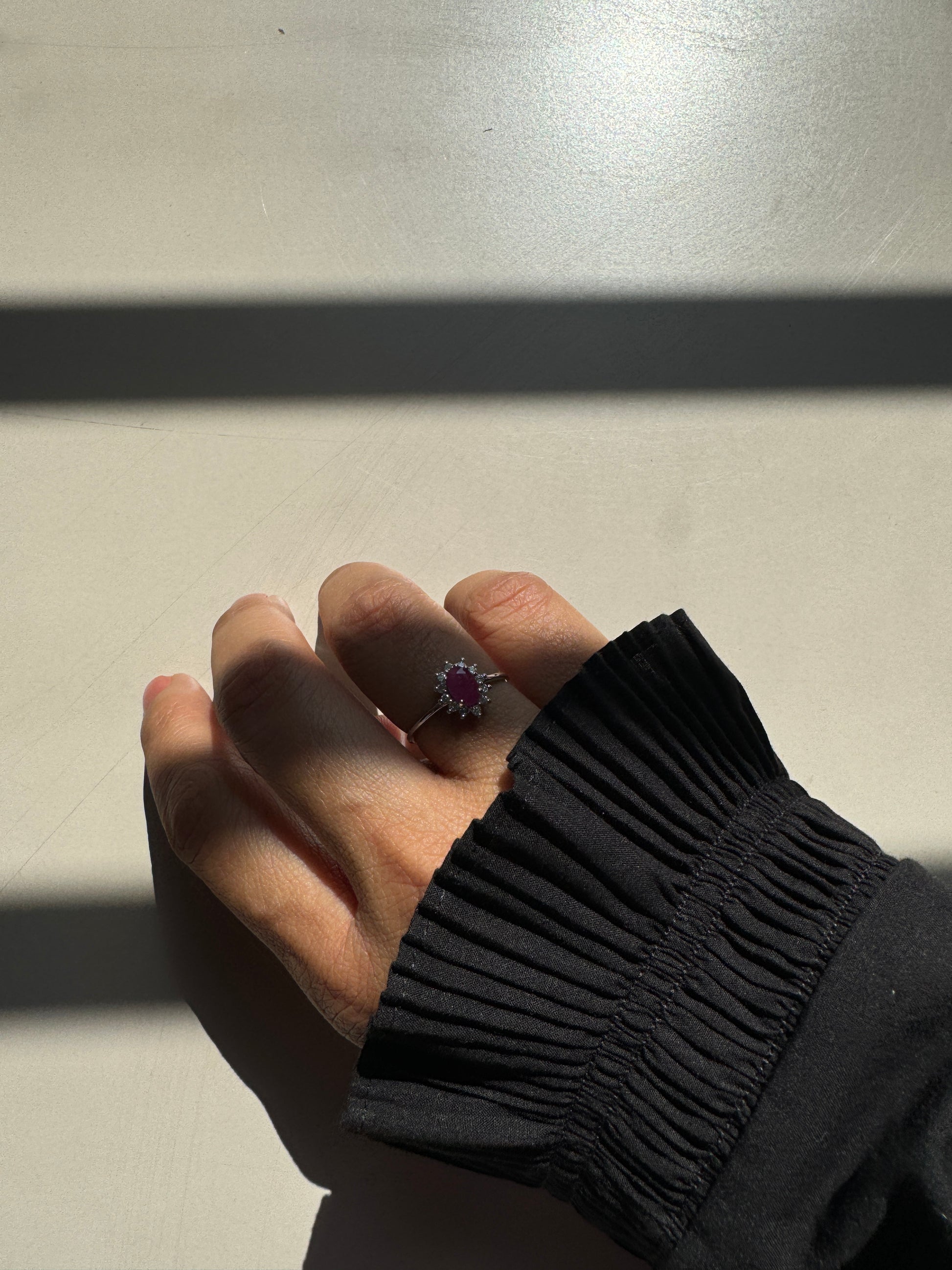 A vivid oval-cut ruby bursts with colour, surrounded by a delicate floral halo of sparkling diamonds. Crafted in Jaipur's skilled workshops with white gold, this ring offers a charming touch of elegance.๐Ÿ’Ž๐ŸŒธโœจ