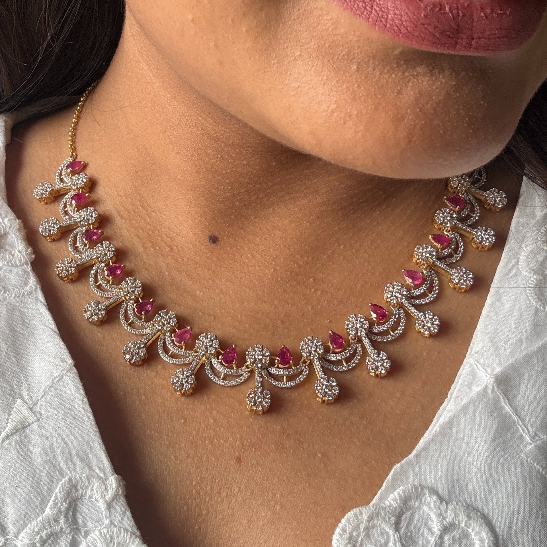 A breathtaking necklace set featuring Natural ruby pear-shaped stones in Gold Vermeil gracefully arranged in a flowing, crescent-inspired pattern, accented with shimmering brilliant-cut white stones for added sparkle. The detailed craftsmanship and fluid design create a regal yet feminine look. Paired with matching drop earrings, this set is perfect for weddings, festive occasions, and evening celebrations. Designed to sit beautifully on the neckline, it adds instant elegance and a luxurious finish to both traditional and fusion outfits. A statement piece that reflects timeless charm with modern finesse ✨
