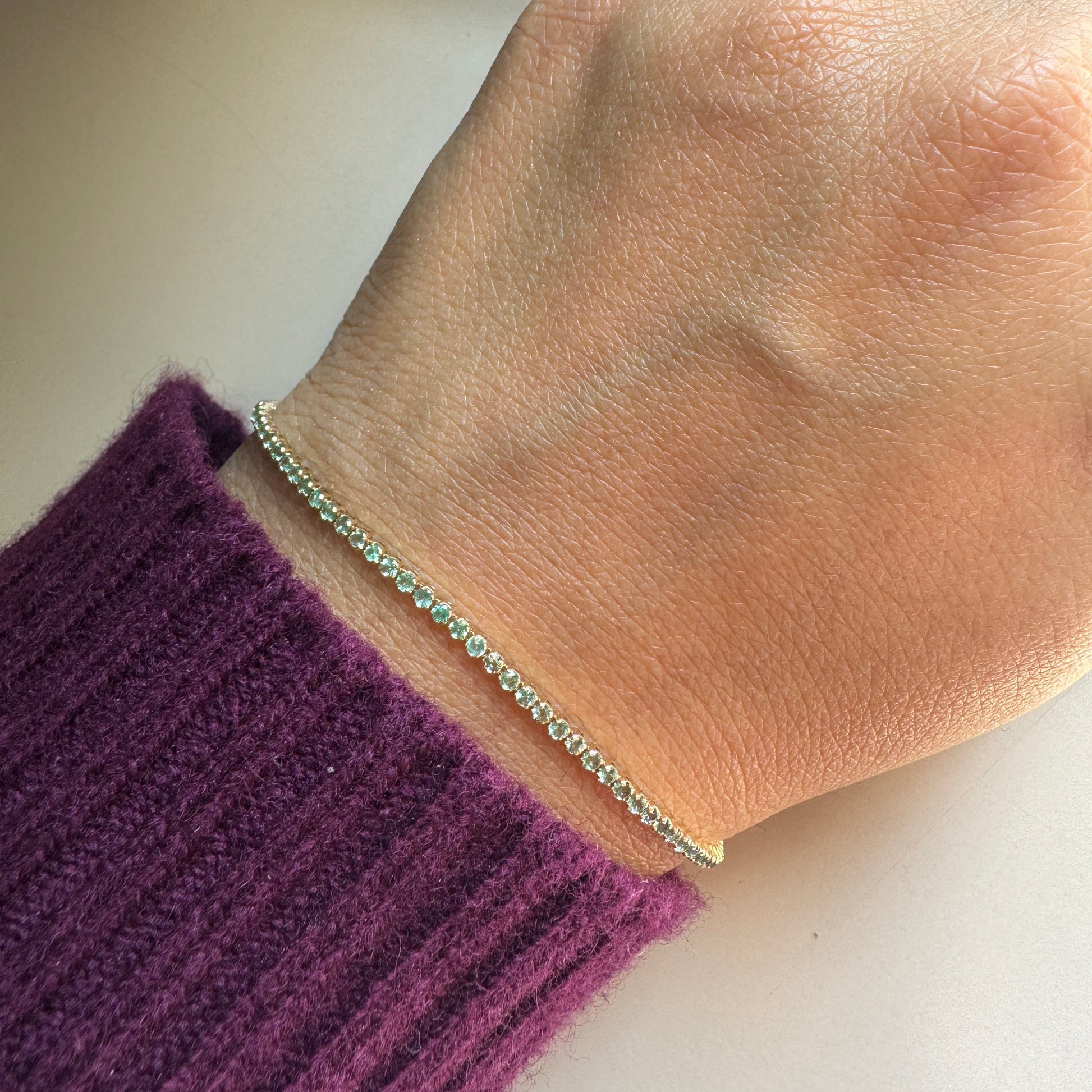 This Emerald Micro Tennis Bracelet features a seamless line of vivid green Natural Zambian emeralds  set in solid gold, radiating refined luxury. Its slim profile makes it perfect for effortless layering or a subtle solo sparkle.✨💚