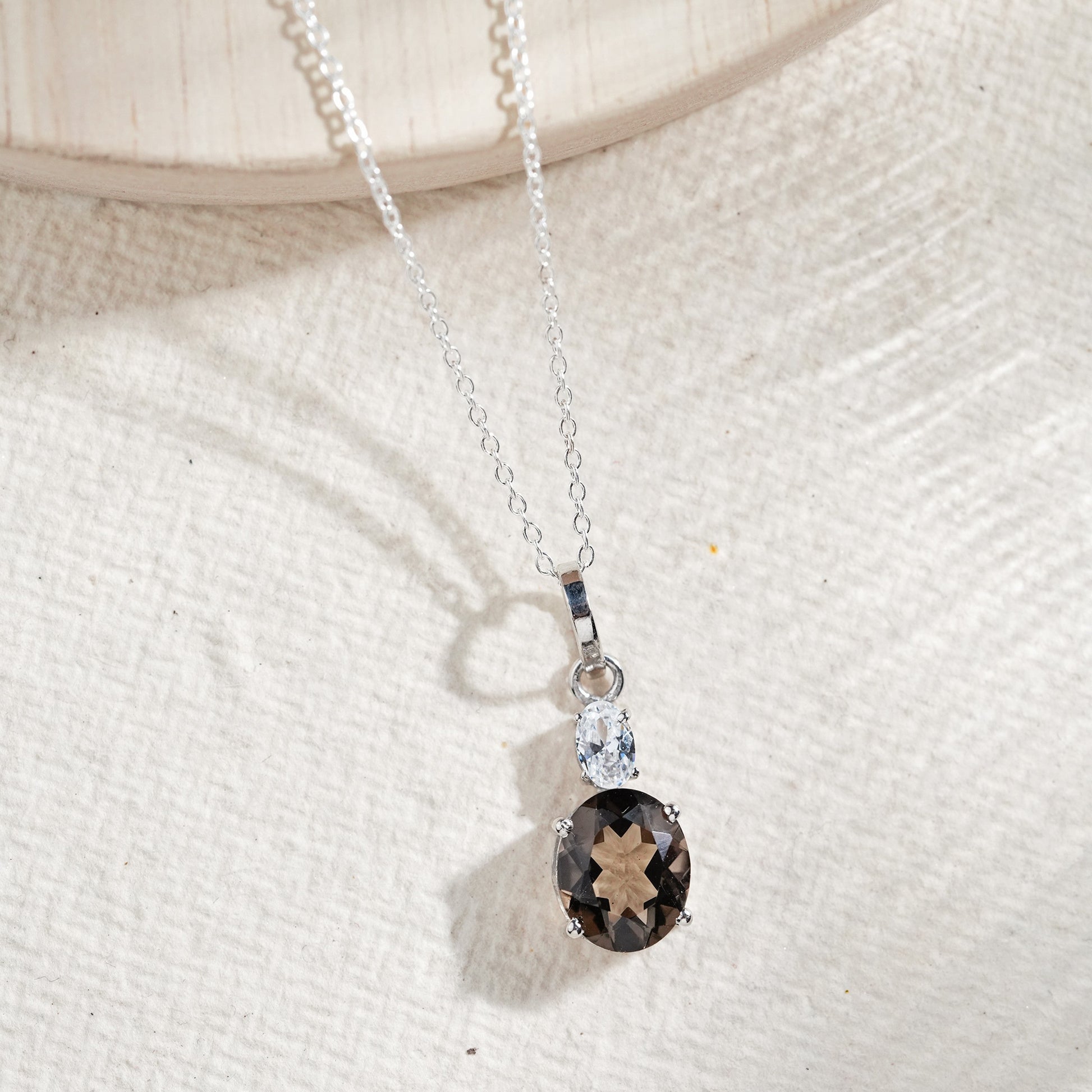 This pendant features a deep, smoky oval-cut gemstone that brings a rich and elegant charm. Above it sits a sparkling white oval stone, creating a sophisticated two-stone drop design. Crafted in premium 925 silver, the contrast of dark and light stones adds a striking appeal. A timeless, versatile piece perfect for both everyday wear and special occasions