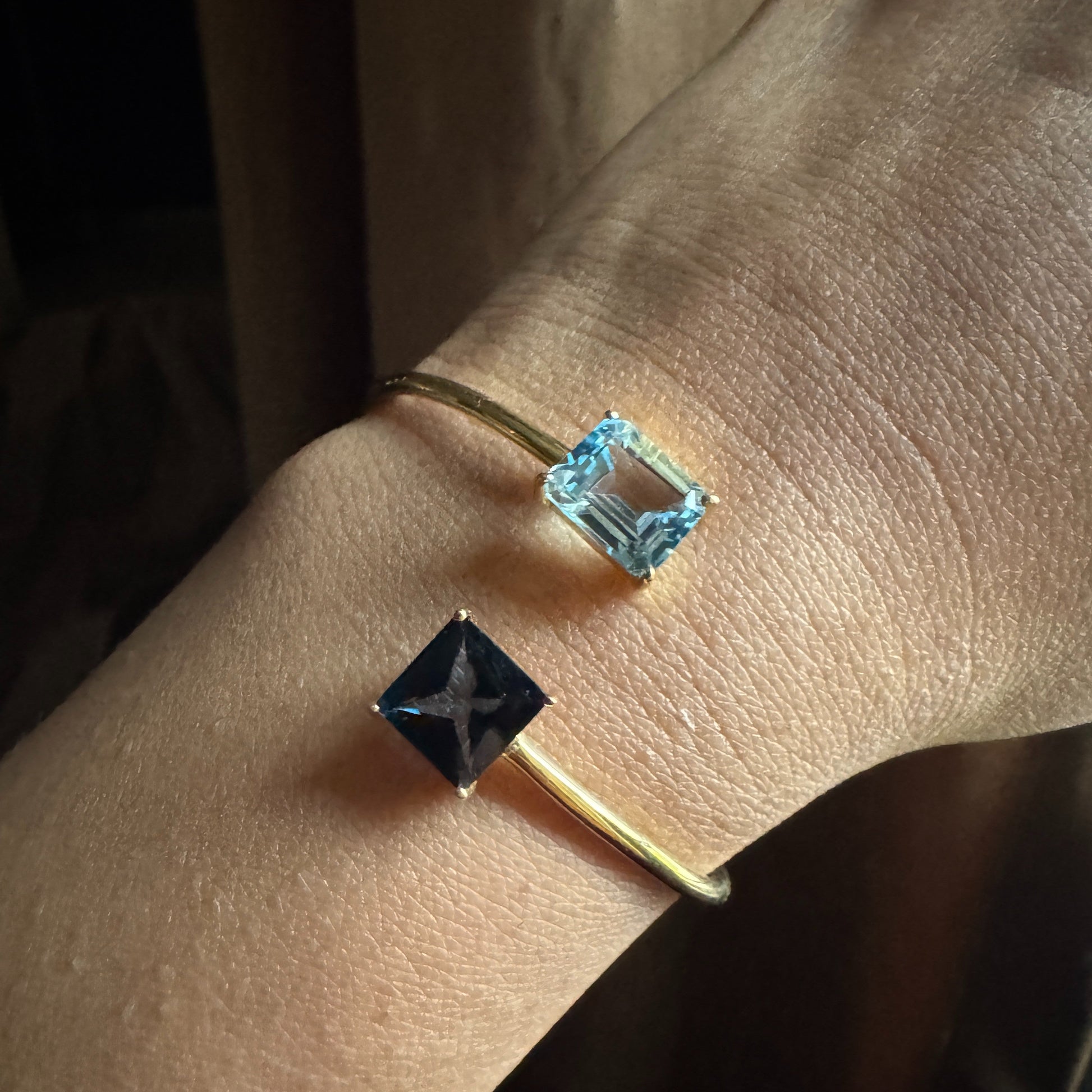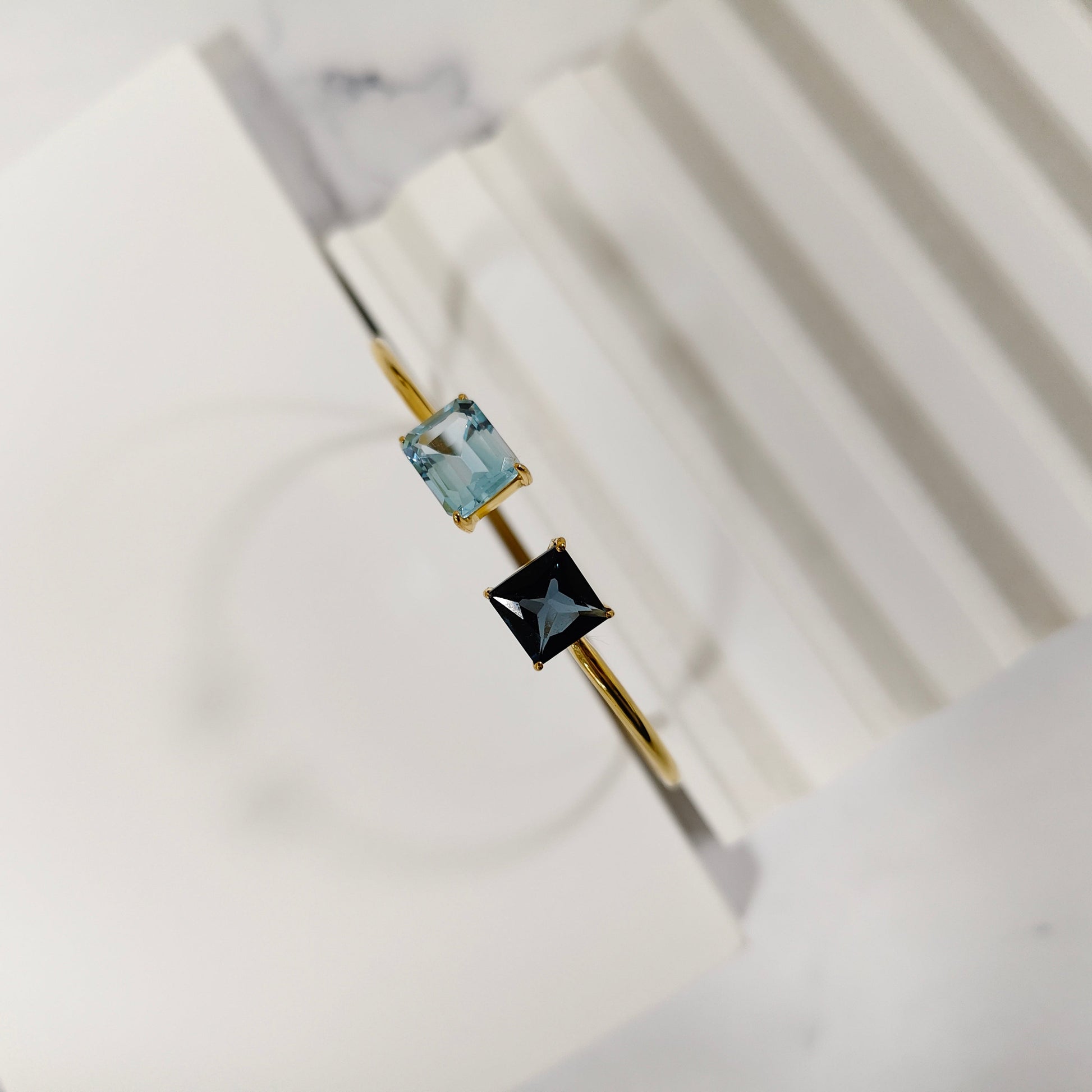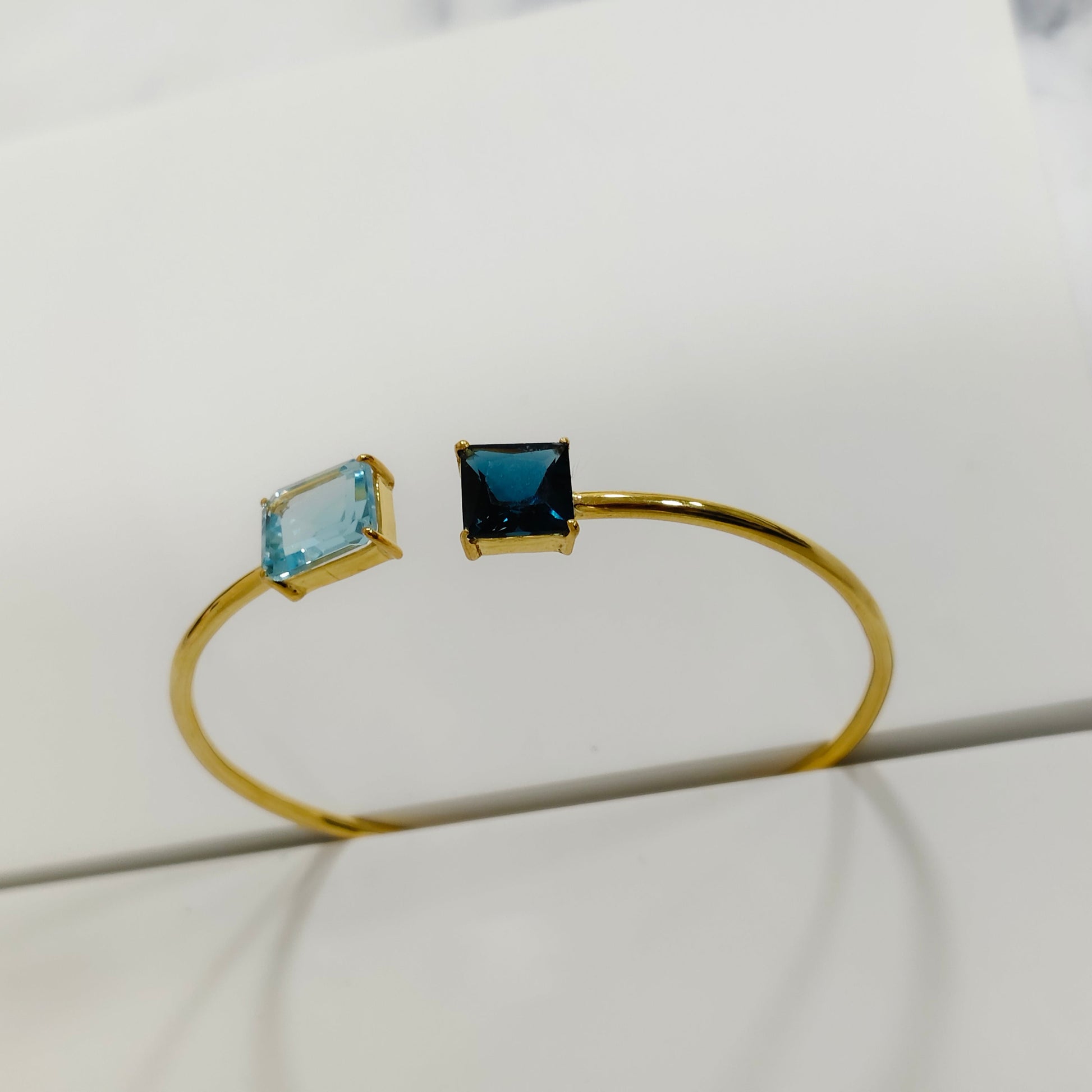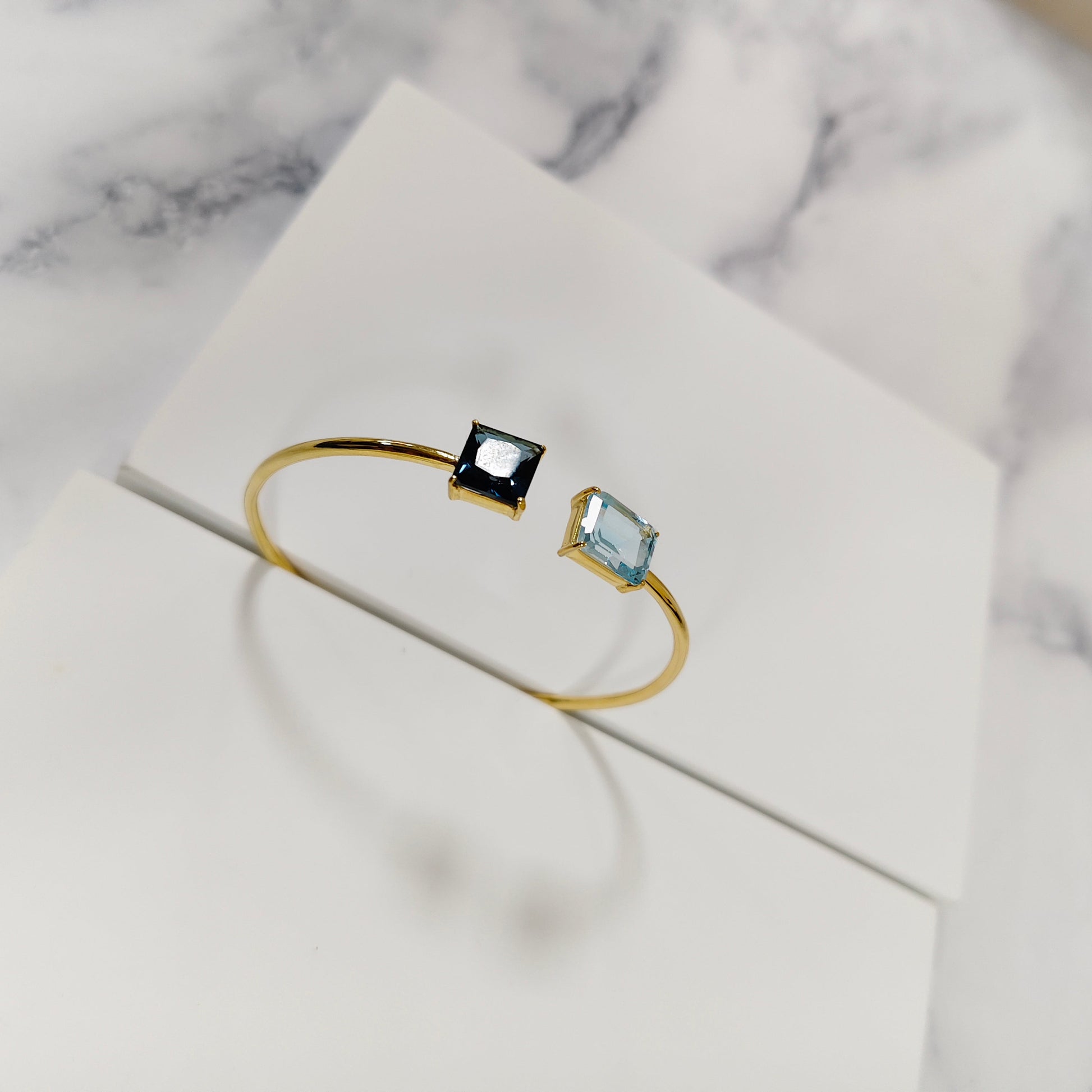 A stunning Blue Topaz gold vermeil bracelet, featuring two radiant octagon-cut gemstones that capture the light beautifully. Crafted in 925 sterling silver with a luxurious 18K gold vermeil finish, this timeless piece adds a touch of sophistication and calm elegance to every look.
