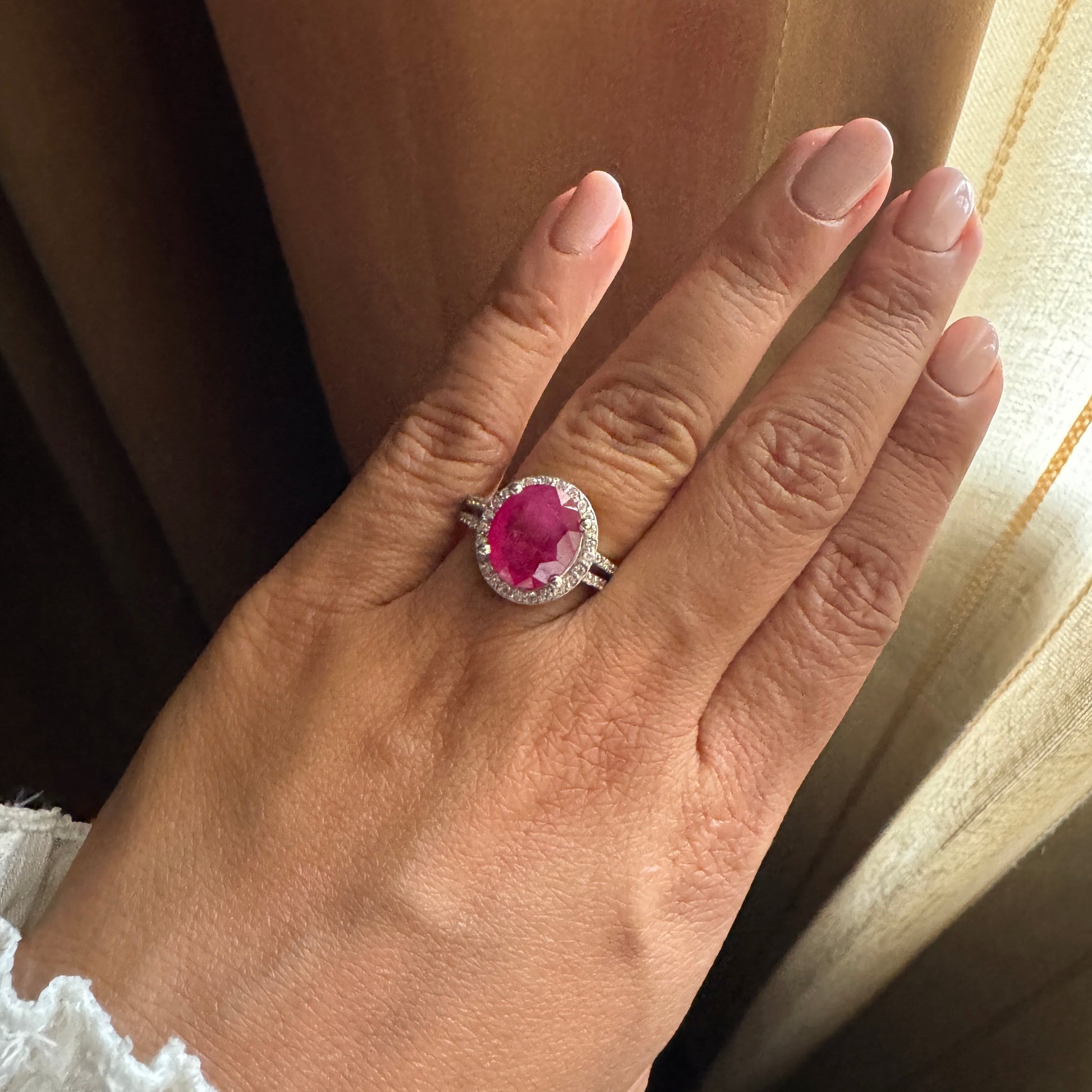 Radiating passion and power, this ring showcases a stunning 6 carat natural ruby, renowned for its deep crimson hue and timeless allure. Symbolizing love, strength, and vitality, ruby is one of the most treasured gemstones in fine jewelry. Expertly set in 925 sterling silver (hallmarked) and accentuated with sparkling white CZ, the design highlights the ruby’s fiery brilliance while adding an elegant touch of luxury. Perfect for special occasions or as a meaningful gift, this ring is a true heirloom piece.