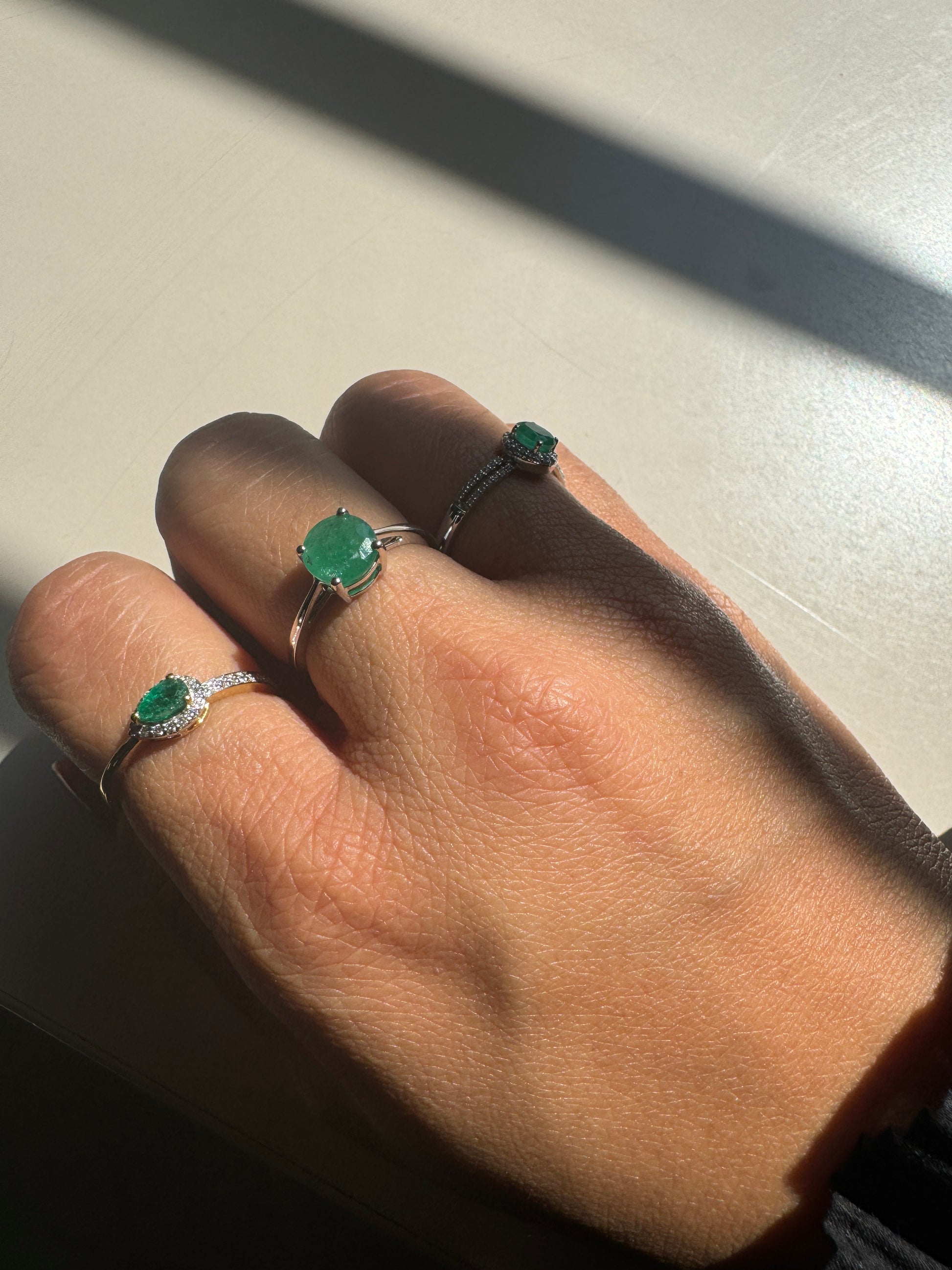 A vibrant round-cut emerald takes centre stage, set in a simple four-prong setting. The lush green gemstone is beautifully complemented by a slender gold band.💚✨