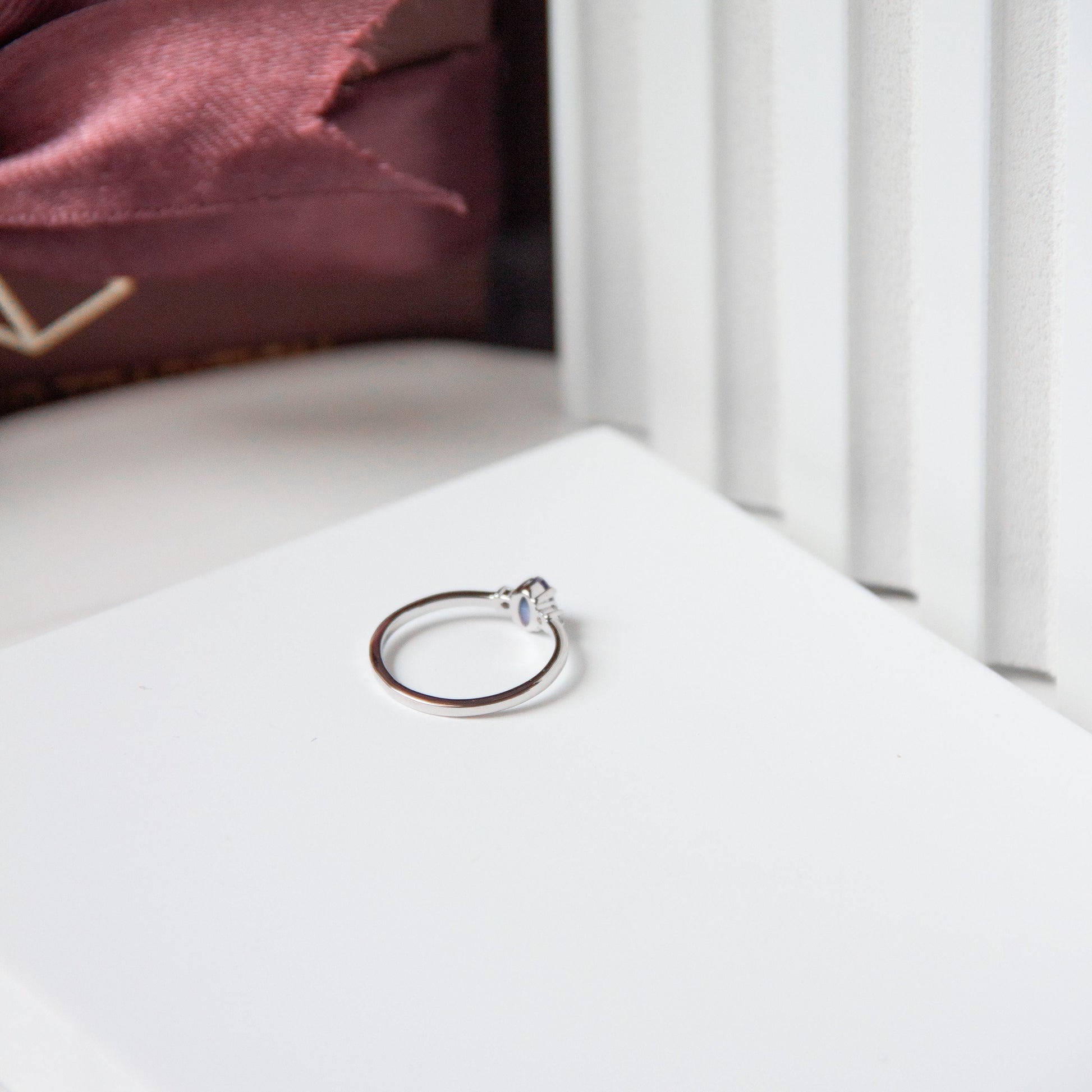 A minimal yet mesmerizing piece, this ring features a natural oval-cut Tanzanite at the center, radiating its signature violet-blue glow. The gemstone is gracefully accented with delicate CZ side stones, adding just the right touch of sparkle without overpowering its simplicity. Set in a sleek and polished band, this ring is the perfect blend of elegance and everyday wear — timeless, dainty, and effortlessly refined.💜